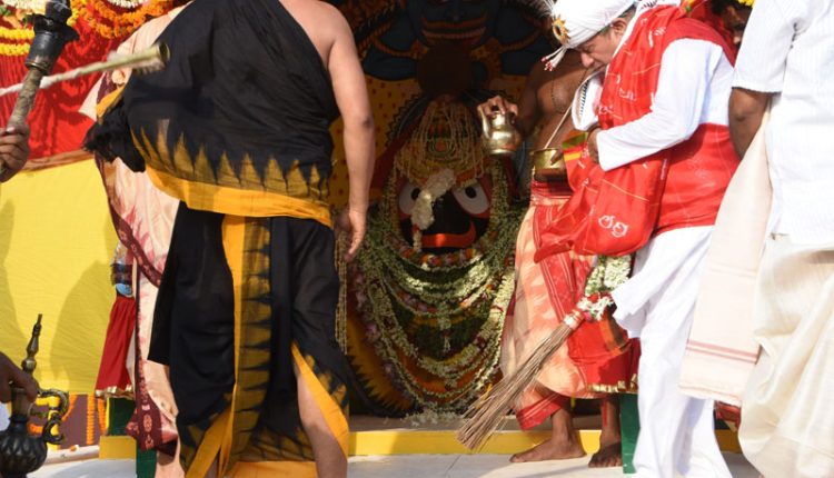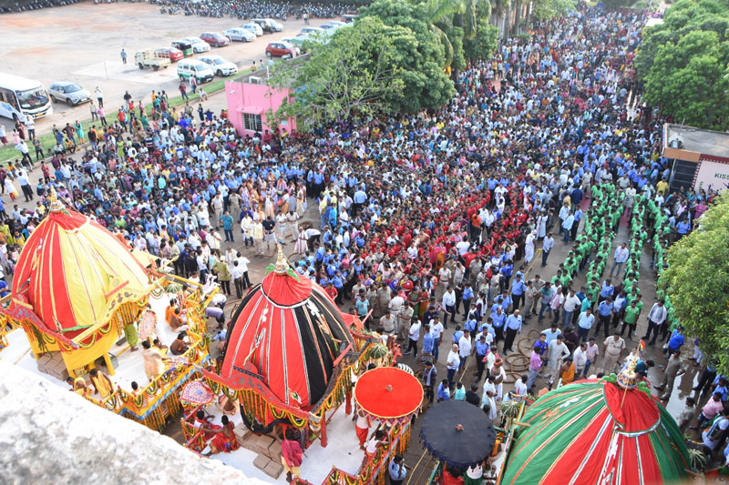 In the forenoon religious ceremonies like “Mangala Arati, Mailama, Tadapalagi, Rosha Homa, Abakasha, Surya Puja’’ and establishment of Chariots were held according to the prescribed time and the ceremonial “Chhera Pahanra’’ was conducted by KIIT-KISS and Founder Achyuta Samanta.