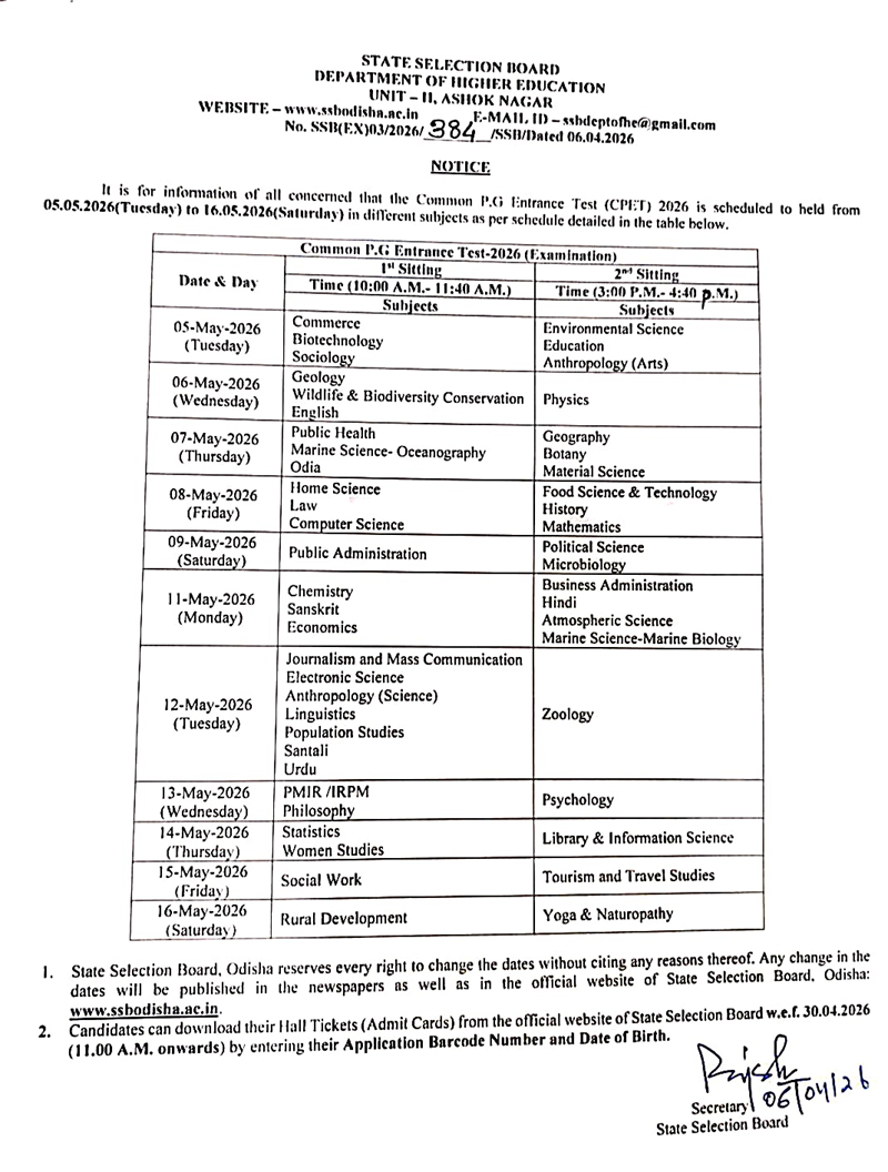 Bhubaneswar, 8th April, 2026: The State Selection Board (SSB) has released the schedule for the CPET (Common PG Entrance Test) 2026. The entrance examination is set to be conducted from 5th May to 16th May, 2026.