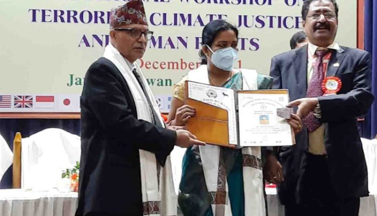 Ms. Mallick, who works as Deputy Nursing Superintendent at the SUM Covid Hospital, received the award from the Minister Counsellor (Political) of Nepal Embassy Mr. Ananda Prasad Sharma, at a function held on Sunday.