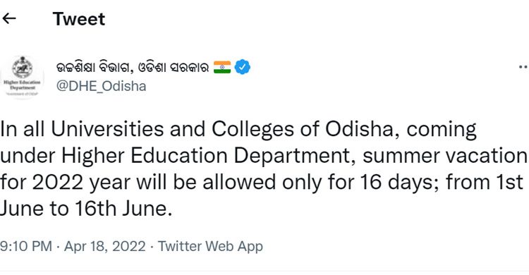 Bhubaneswar (Kalinga Voice) : The state government has decided to reduce the duration of summer vacation in Universities and Colleges . In all Universities and Colleges of Odisha, coming under Higher Education Department, summer vacation for 2022 year will be allowed only for 16 days; from 1st June to 16th June.