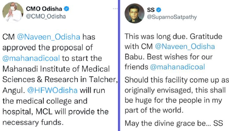 Bhubaneswar(Kalinga Voice) : Socio-political and Chairman of Smt. Nandini Satpathy Memorial Trust (SNSMT) Shri. Suparno Satpathy has expressed gratitude with CM Naveen Patnaik for the approval of Talcher Medical College. In a tweet Shri. Satpathy says ” This was long due. Gratitude with CM @Naveen_Odisha Babu. Best wishes for our friends @mahanadicoal Should this facility come up as originally envisaged, this shall be huge for the people in my part of the world.”