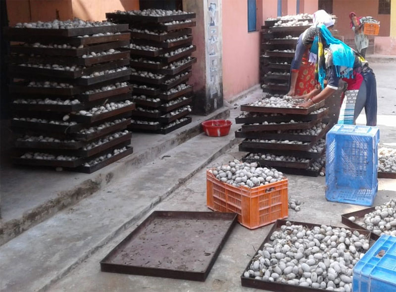 Till now, over 3000 farmers from Bonai, Koira, Lahunipara, Bisra & Bargaon blocks grow Tasar and sell cocoon to the TRCS as the final product. The farmers produce over 10 lakh cocoons every year amounting to a business of over 2 crores. SERIFED, as the apex body of the TRCSs in the state level buys the cocoon and sells it in the open market. But, with the completion of Silk Park, reeling and weaving activities along with value added production will upscale the process.
