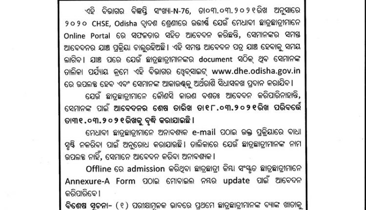 Bhubaneswar/Kalinga Voice: Timeline for submission of online application for DBT of Cash in lieu of Laptop to 12th pass out meritorious students(CHSE, Odisha) has been extended till 31.03.2021, says Higher Education Dept., Govt. of Odisha today in a tweet .
