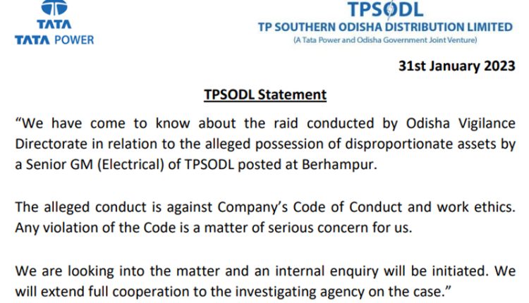 Bhubaneswar (Kalinga Voice) : TPSODL issues Statement on Vigilance raid conducted in relation to the alleged possession of disproportionate assets by a Senior GM (Electrical) of TPSODL. In a press release, TPSODL authority says “We have come to know about the raid conducted by Odisha Vigilance Directorate in relation to the alleged possession of disproportionate assets by a Senior GM (Electrical) of TPSODL posted at Berhampur.