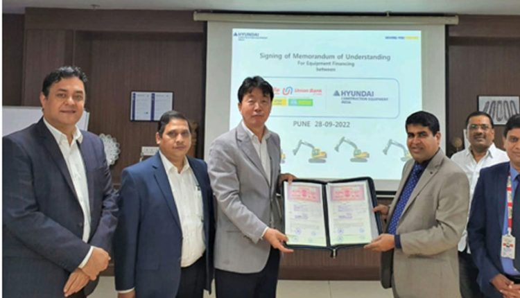 Mumbai,: Union Bank of India today entered partnership with Hyundai Construction Equipment India Ltd for extending Equipment Finance to the Customers of Hyundai. Under the partnership, Union Bank of India and Hyundai have mutually agreed to pool their resources together and be associated with each other for mutual benefits. The wider reach of the Bank will help both Union Bank of India and Hyundai to extend the best offering to the buyers of Hyundai Equipment across the country and to increase the Bank’s portfolio under Equipment Finance.