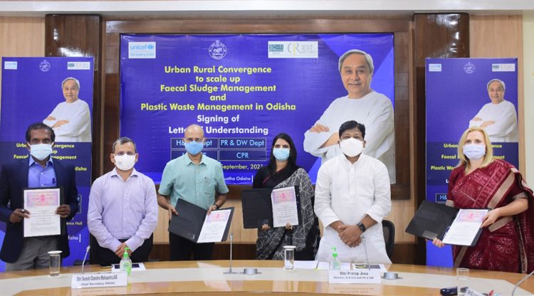 Bhubaneswar, (Kalinga Voice):-A Letter of Understanding (LoU) was signed between the departments of Housing and Urban Development (H&UD) and the Panchayati Raj and Drinking Water (PR&DW), UNICEF and Centre for Policy Research (CPR) today for urban-rural convergence on Faecal Sludge and Septage Management (FSM) and Plastic Waste Management (PWM). This unique initiative aims to strengthen the efforts of both departments to ensure district-wide sanitation through urban-rural convergence for FSM and PWM services in seven districts in the first phase. The initiative is being launched in Angul, Balasore,Dhenkanal, Ganjam, Khurda, Mayurbhanj and Sambalpur which will be scaled up to all districts in the State subsequently.