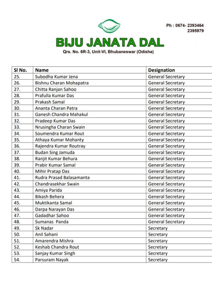 Bhubaneswar (Kalinga Voice) : The Biju Janata Dal District committee of Jajpur District has been reorganized. New office bearers are appointed with the approval of the President of the party Shri Naveen Patnaik. Priyanath Mohapatra is appointed as Secretary-General. Apart from it there are 23 Vice presidents, 24 General Secretaries and 37 Secretaries are in the District Committee,informed BJD General Secretary (Media Affairs) Sri Manas Ranjan Mangaraj in a press release today.