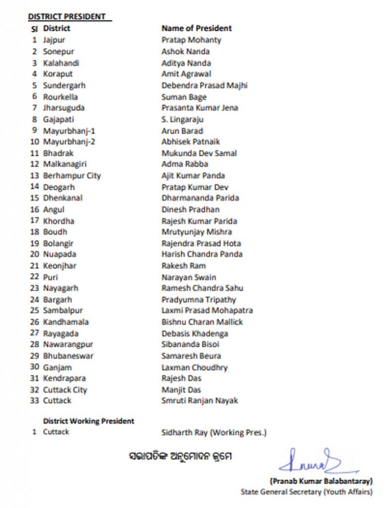 - President of 33 Organizing Districts and an Additional working President for Cuttack District appointed