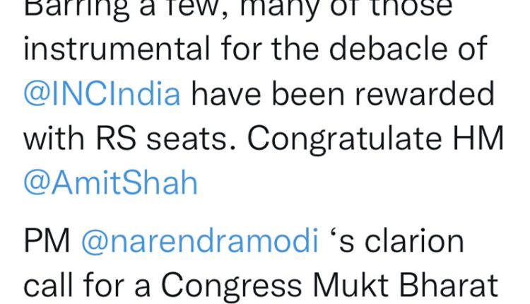 Shri. Satpathy went a step ahead to congratulate Home Minister Amit Shah. In a tweet Shri. Satpathy says ” Barring a few, many of those instrumental for the debacle of @INCIndia have been rewarded with RS seats. Congratulate HM @AmitShah PM @narendramodi ‘s clarion call for a Congress Mukt Bharat seems very much on track”